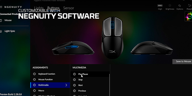Với phần mềm HyperX NGENUITY người dùng có thể dễ dàng tinh chỉnh các thiết lập DPI hiệu ứng đèn RGB hai vùng và gán lại tối đa 5 nút chức năng cho từng nhu cầu cụ thể như gaming làm việc hay sáng tạo nội dung. Giao diện phần mềm trực quan dễ sử dụng và hỗ trợ lưu cấu hình trực tiếp trên bộ nhớ onboard của chuột giúp bạn mang theo các thiết lập cá nhân hóa mọi lúc mọi nơi. Đặc biệt RGB chỉ có thể tuỳ chỉnh khi sử dụng ở chế độ 2.4GHz để tối ưu pin. Đây là công cụ mạnh mẽ giúp người dùng khai thác tối đa tiềm năng và trải nghiệm cá nhân hoá toàn diện với chiếc chuột HyperX này.
