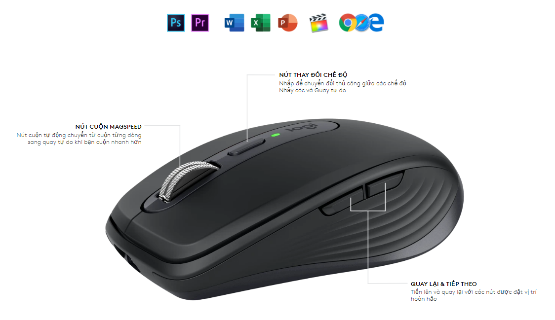 Tùy biến theo từng ứng dụng Logitech MX Anywhere 3S hoàn toàn có thể tùy chỉnh trong mọi ứng dụng bạn dùng – và bạn sẽ làm việc nhanh hơn với các cấu hình dựng sẵn cho ứng dụng cụ thể*. trong Adobe Photoshop, Adobe Premiere Pro, Final Cut Pro, Google Chrome, Safari, Microsoft Word, Excel và PowerPoint.. |