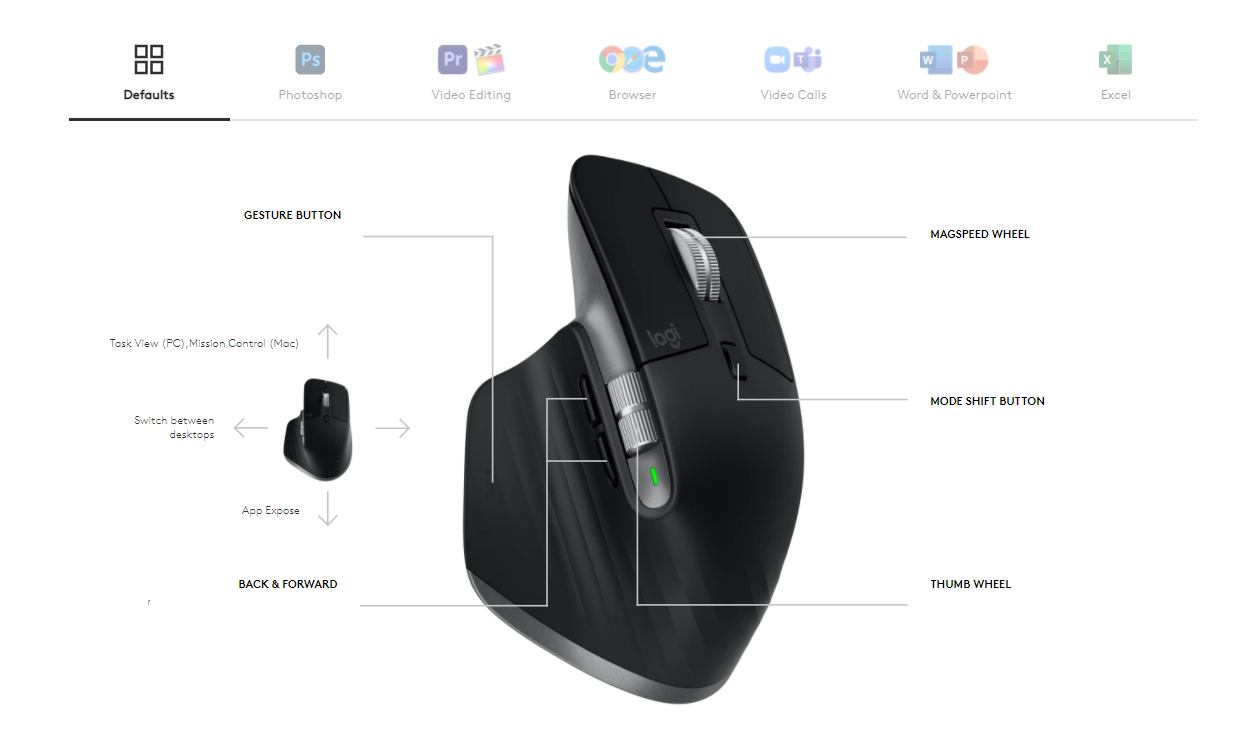 Tùy biến theo từng ứng dụng MX Master 3 hoàn toàn có thể tùy chỉnh trong macOS và hầu như mọi ứng dụng bạn sử dụng, giúp bạn sẽ làm việc nhanh hơn với các tùy chỉnh được xác định trước được tối ưu hóa cho các ứng dụng yêu thích của bạn như Adobe Photoshop, Adobe Premiere Pro, Final Cut Pro, Google Chrome, Safari, Zoom, Microsoft Teams, Word, Excel, PowerPoint và Edge. |