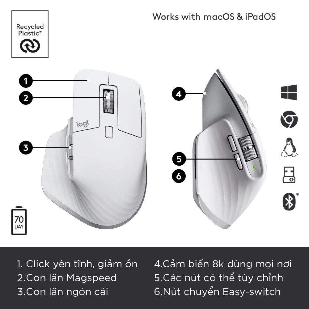 Chuột hỗ trợ kết nối Bluetooth Low Energy và USB Logi Bolt receiver, giúp hoạt động ổn định trong phạm vi lên đến 10 mét. Đặc biệt, người dùng có thể kết nối cùng lúc 3 thiết bị khác nhau và chuyển đổi giữa các thiết bị dễ dàng bằng nút bấm chuyển kênh, hỗ trợ đa nhiệm tối đa trên Windows, macOS, iPadOS và cả Linux. Tính năng Logi Flow còn cho phép copy-dán và kéo thả file giữa nhiều máy tính như đang dùng chung một hệ điều hành.