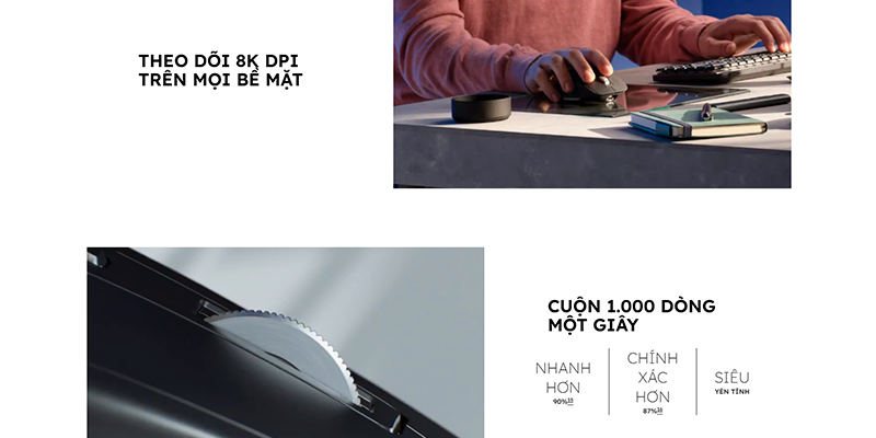 Trang bị cảm biến Darkfield độ phân giải lên tới 8000 DPI, Logitech MX Master 3S hoạt động chính xác trên mọi bề mặt, kể cả kính, với độ chính xác cực cao. Người dùng có thể tùy chỉnh mức DPI từ 200 đến 8000 với bước tăng 50 DPI thông qua phần mềm Logi Options+. Điều này cho phép cá nhân hóa tốc độ chuột theo nhu cầu thực tế: từ thao tác chi tiết trong thiết kế đồ họa đến cuộn nhanh khi xử lý bảng tính hoặc văn bản dài.