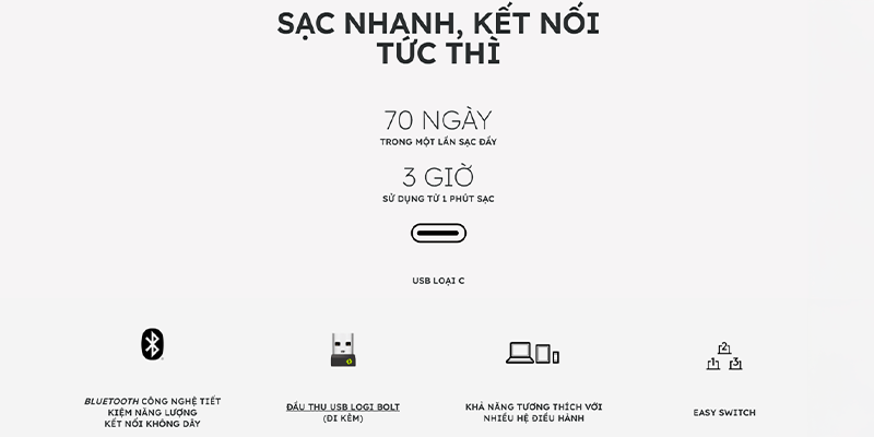 Kết nối linh hoạt với Bluetooth và Logi Bolt, hỗ trợ tối đa 3 thiết bị