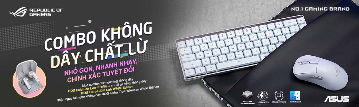 NHẬN NGAY QUÀ TẶNG ASUS KHI MUA COMBO BÀN PHÍM GAMING KHÔNG DÂY ROG FALCHION LOW PROFILE VÀ CHUỘT GAMING KHÔNG DÂY ROG HARPE ACE AIM LAB MÀU TRẮNG!!!