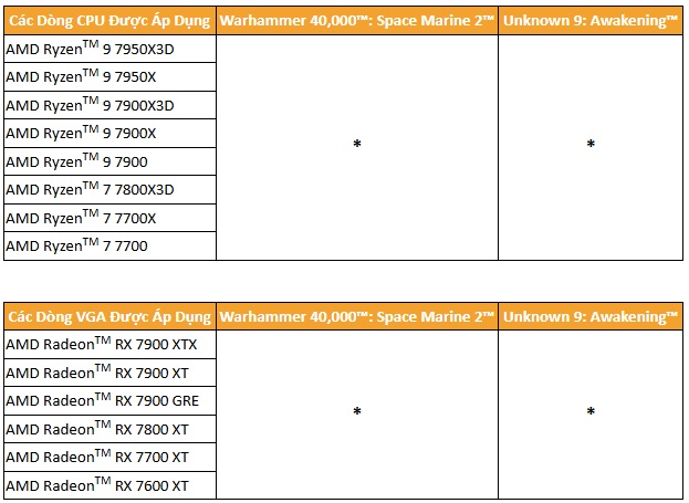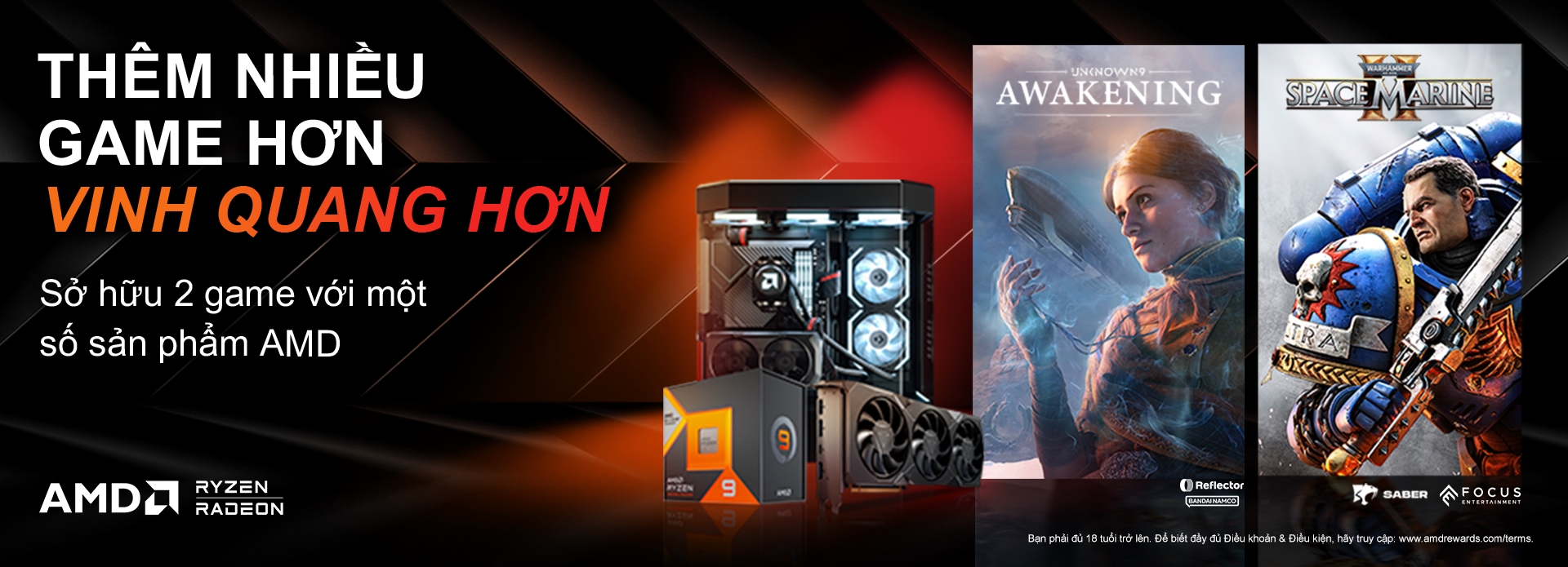 - Khách hàng sẽ nhận ngay code game Warhammer 40,000™: Space Marine 2™ & Unknown 9: Awakening™ khi sở hữu CPU AMD Ryzen™ hoặc VGA AMD Radeon™ theo danh sách sản phẩm bên dưới.