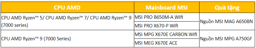 Khi khách hàng build PC có dùng Combo CPU AMD Ryzen™ 7000 và Mainboard MSI tùy theo mã sản phẩm tại MemoryZone sẽ được nhận ngay quà tặng là nguồn MSI tùy theo dòng CPU và Mainboard tương ứng: