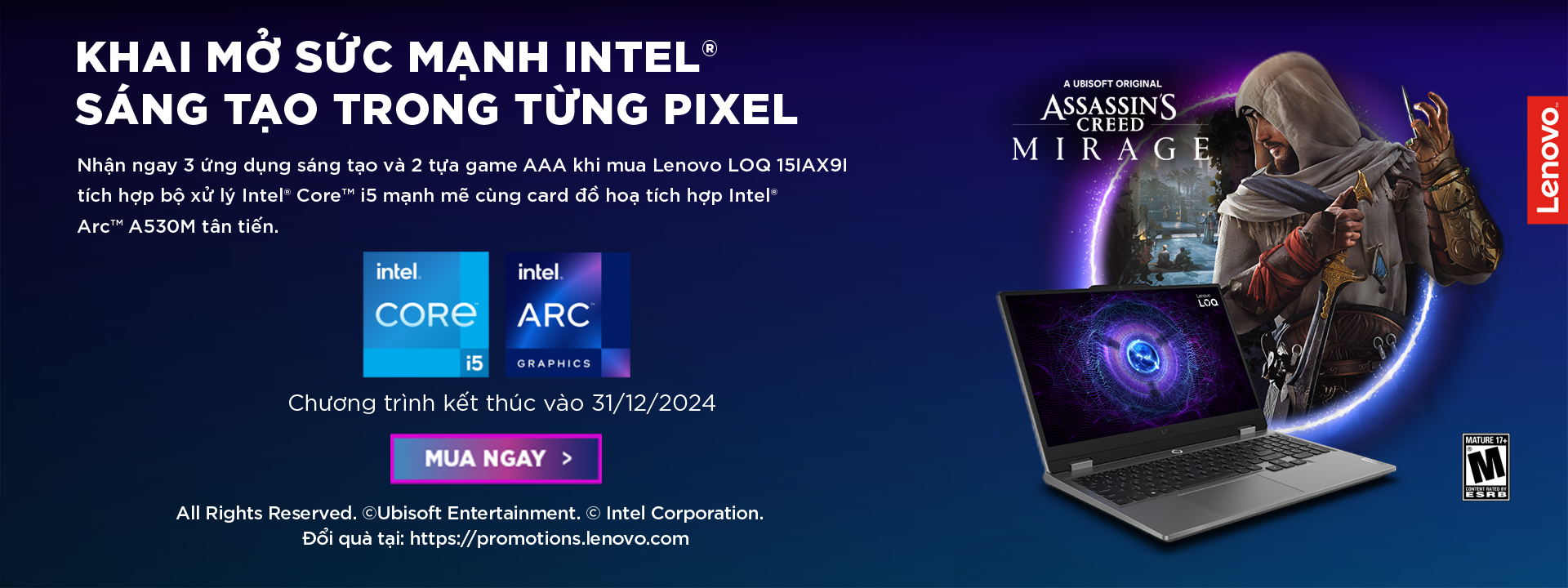 Nhận ngay 3 ứng dụng sáng tạo và 2 tụa game AA khi mua Lenovo LOQ 15IAX9I tích hợp bộ xử lý Intel Core i5 mạnh mẽ cùng card đồ hoạ tích hợp Intel Arc A530M tân tiến