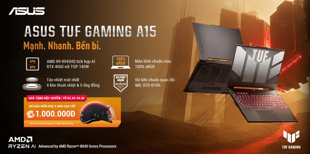 Chương trình áp dụng cho khách hàng khi mua sản phẩm laptop ASUS TUF Gaming A15 tại ASUS Store và tất cả cửa hàng của MemoryZone (online + offline) từ ngày 05/04/2024 - 30/06/2024.
