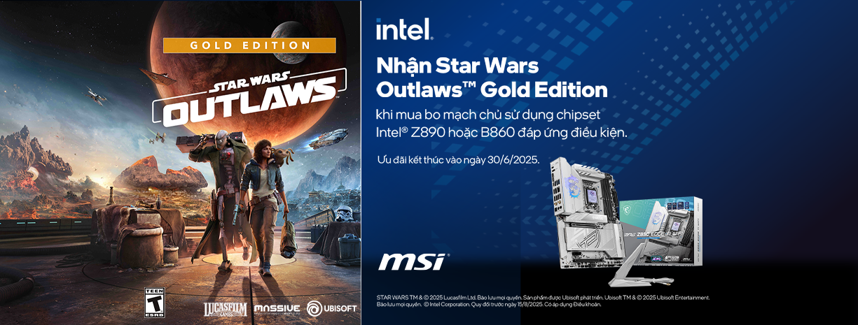 Chương trình áp dụng cho người dùng cuối, khi mua bo mạch chủ MSI chipset Intel® Z890 hoặc Intel® B860, đăng ký thông tin để nhận được codegame Star Wars Outlaws™ Gold Edition.