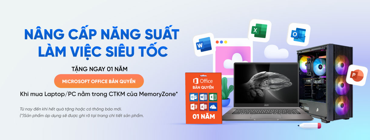 - Chương trình được ap dụng với tất cả các dòng sản phẩm Laptop/PC có ghi chú trong phần khuyến mãi tại MemoryZone ngoại trừ các sản phẩm đã có bản quyền Office đi kèm sản phẩm.