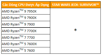 Khách hàng sẽ nhận được ngay code game STAR WARS JEDI: SURVIVOR™ khi mua các mã CPU AMD Ryzen™ dưới đây: