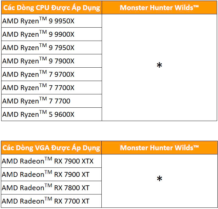 Khách hàng sẽ nhận ngay code game Monster Hunter Wilds™ khi sở hữu CPU AMD Ryzen™ hoặc VGA AMD Radeon™ theo danh sách sau: