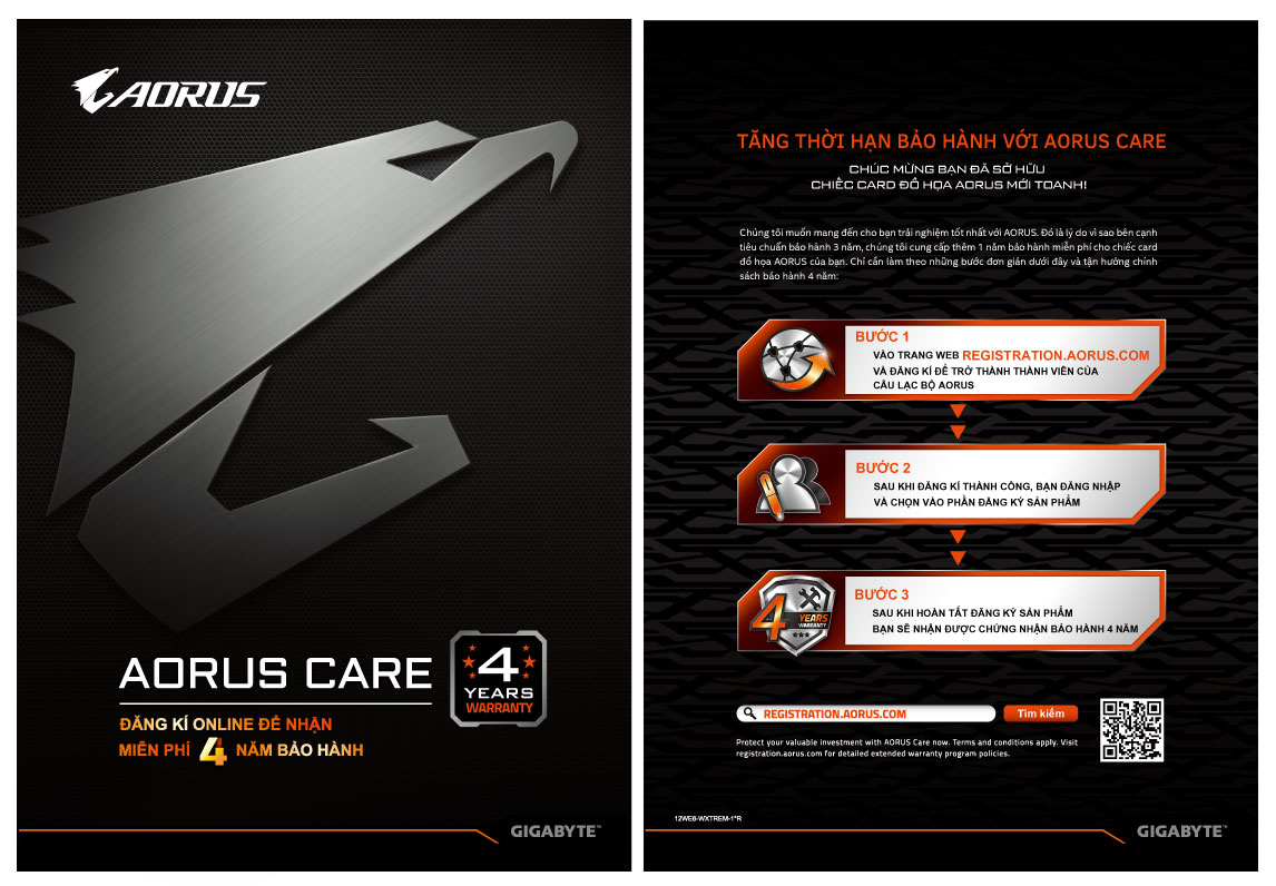 Với mong muốn mang đến cho khách hàng những trải nghiệm tốt nhất với AORUS. Bên cạnh tiêu chuẩn bảo hành 3 năm, chúng tôi cung cấp thêm 1 năm bảo hành miễn phí cho chiếc card đồ họa AORUS của bạn. Chỉ cần làm theo những bước đơn giản dưới đây và tận hưởng chính sách bảo hành 4 năm:
