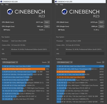 Thử nghiệm đầu tiên với bài thử cực kỳ thông dụng, CineBench R23. Với điểm số gốc ở bên trái và điểm số khi được ép xung tự động, ta có thể nhận thấy điểm số đa nhân Multi Core được cải thiện khoảng 3% trong khi điểm số đơn nhân Single Core tăng tới 7,5%.