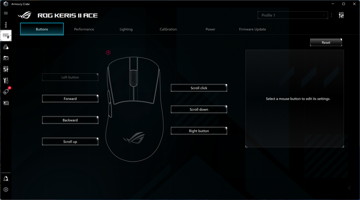 Keris II Ace sử dụng phần mềm Armoury Crate để điều chỉnh cài đặt và tùy chỉnh chuột. Tuy nhiên, phần mềm này có thể khá phức tạp và tốn nhiều dung lượng (khoảng 530MB).