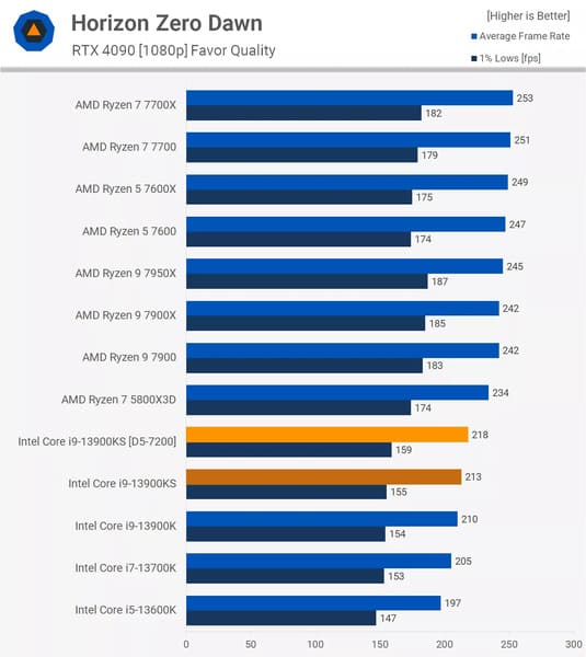 Mức tăng hiệu suất 1,5% được xem xét trong Horizon Zero Dawn cho 13900KS. Nếu sử dụng bộ nhớ DDR5-7200MHZ, hiệu suất sẽ tăng thêm 2%, đạt tốc độ 218 khung hình/giây.