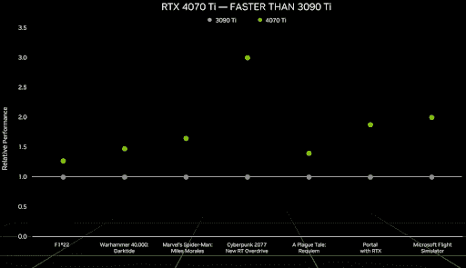 Theo biểu đồ Nvidia's Super Misleading: Hiệu suất gấp ba lần nhưng khi so sánh kết xuất đồ họa thông thường trên RTX 3090 Ti với DLSS 3 trên RTX 4070 Ti thì lại không có chú thích để chỉ ra rõ ràng. Nvidia có một sản phẩm đủ tốt để họ không cần kiểu biểu đồ này. Việc Marketing kém làm tăng sự nghi ngờ theo quan điểm của người test.