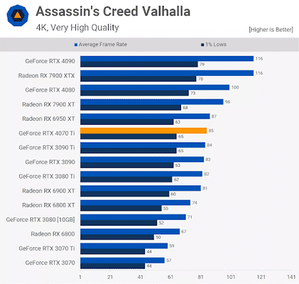 Kết quả của Assassin's Creed Valhalla cũng giống như vậy, ở độ phân giải 1440p, 4070 Ti phải đối mặt với hiệu suất hàng đầu từ thế hệ trước, chỉ chậm hơn 2% so với 6950 XT và nhanh hơn 5% so với 3090 Ti. Mặc dù chiếc card chỉ chậm hơn 12% so với RTX 4080, nhưng nó vẫn chậm hơn 13% so với 7900 XT.