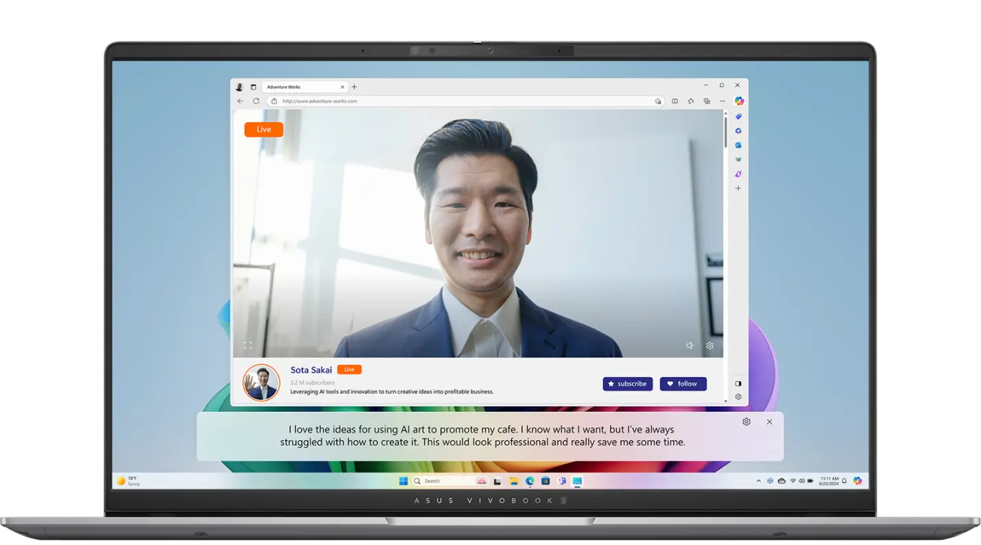 Laptop Copilot+ PC ASUS Vivobook S 15 được trang bị một loạt những tính năng AI độc quyền của những mẫu máy đạt chuẩn Copilot+ PC như Live Captions, Cocreator, Auto Super Resolution, Hiệu ứng Windows Studio Effects, Adaptive Dimming và Adaptive Lock… giúp người dùng tăng tốc cho quá trình làm việc cũng như giải trí hằng ngày.