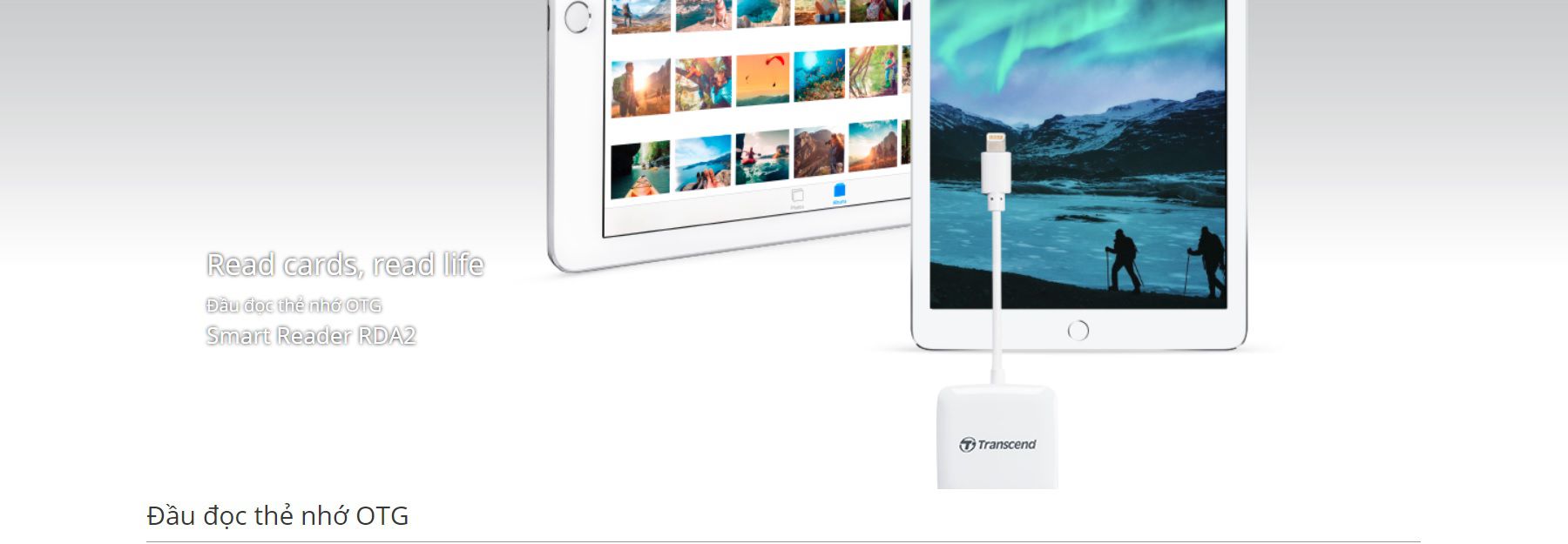 Đầu đọc thẻ OTG cho thiết bị iOS Đầu đọc thẻ nhớ Transcend OTG Lightning TS-RDA2W được trang bị đầu kết nối Lightning được thiết kế đặc biệt cho các thiết bị iOS, bao gồm iPhone®, iPad® và iPod®. Với đầu đọc thẻ nhớ Transcend OTG Lightning TS-RDA2W trong tay, bạn có thể chia sẻ ảnh và video có độ phân giải cao từ máy ảnh lên mạng xã hội cực nhanh. |