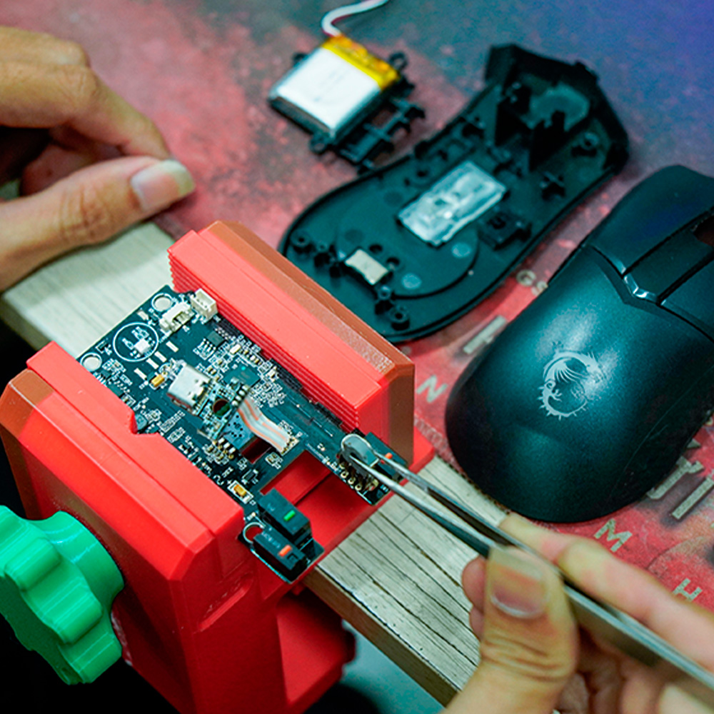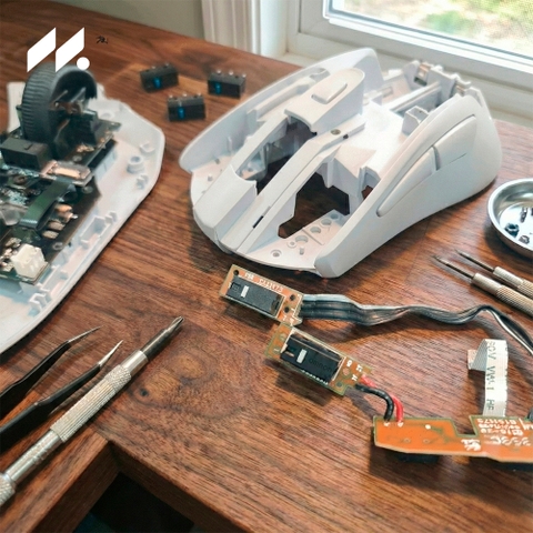 Kỹ thuật bảo toàn Mouse Feet: Một trong những rủi ro khi tự sửa chuột là làm hỏng bộ Feet (đế trượt) bên dưới. Kỹ thuật viên của chúng tôi sử dụng máy khò nhiệt chuyên dụng để bóc tách Feet nhẹ nhàng, giữ nguyên độ phẳng để chuột di chuyển mượt mà sau khi lắp lại.