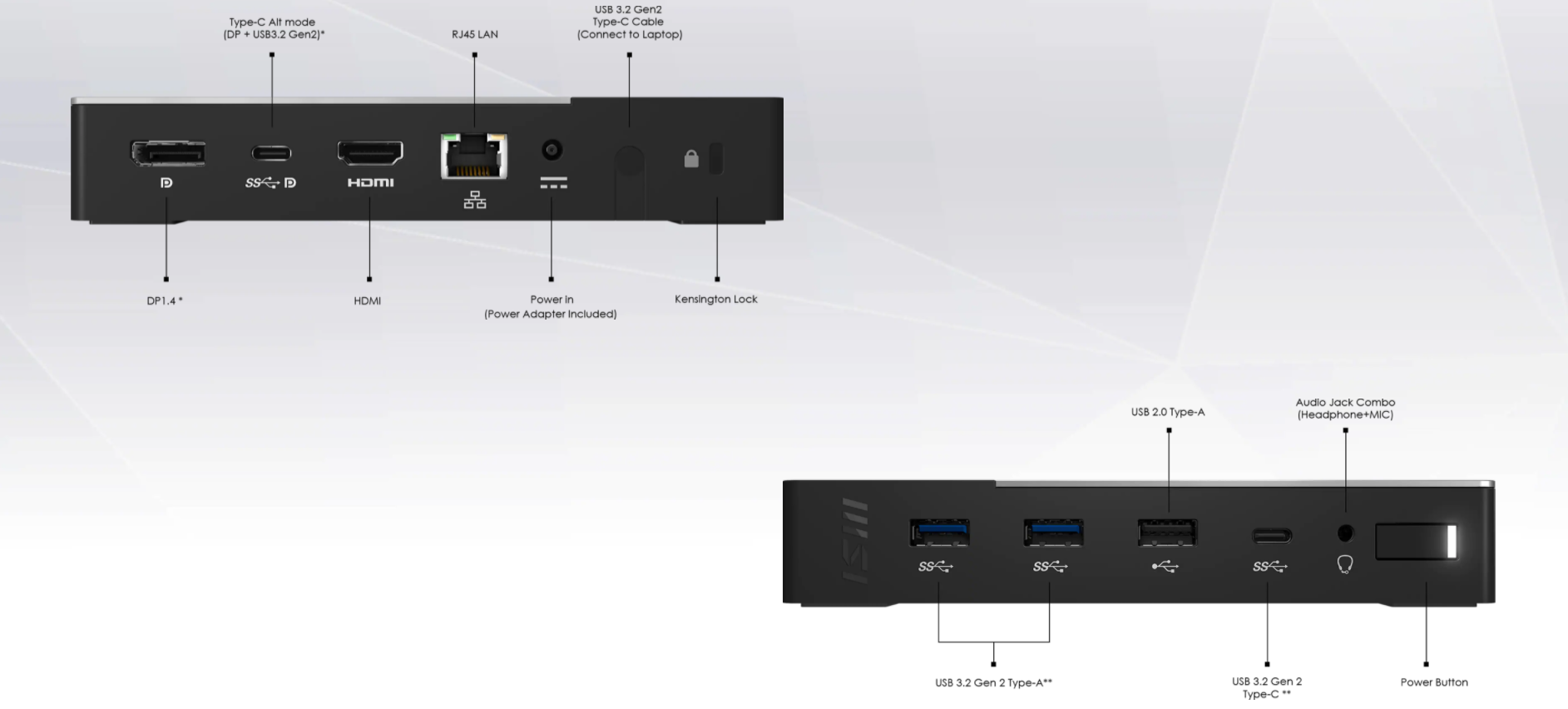Đa dạng cổng kết nối Với hệ thống cổng kết nối đầy đủ, Docking USB Type-C MSI Station Gen 2 có thể truyền file hay tín hiệu video trong tích tắc. Bạn sẽ có toàn bộ những cổng kết nối cần thiết cho mọi nhu cầu làm việc