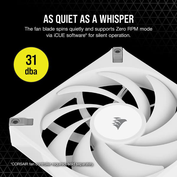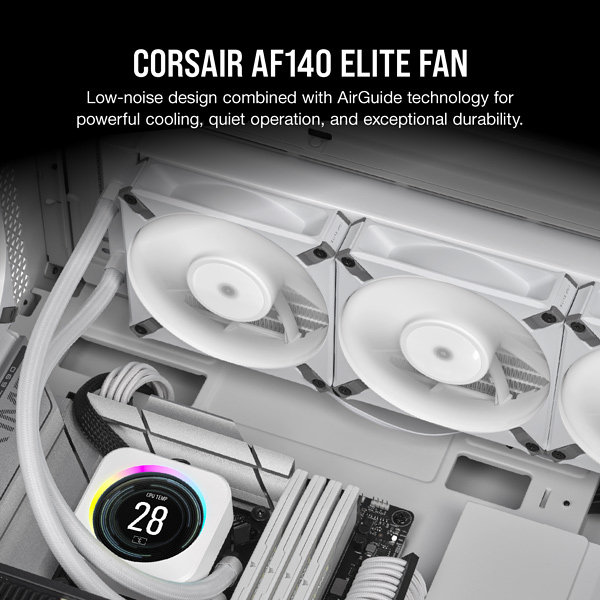 Quạt êm không tiếng Được thiết kế để hỗ trợ chế độ Zero RPM, quạt AF ELITE loại bỏ tiếng ồn của quạt bằng cách chỉ quay lên khi nhiệt độ đạt đến ngưỡng bạn đã đặt bằng phần mềm iCUE của CORSAIR với bộ điều khiển quạt CORSAIR COMMANDER |