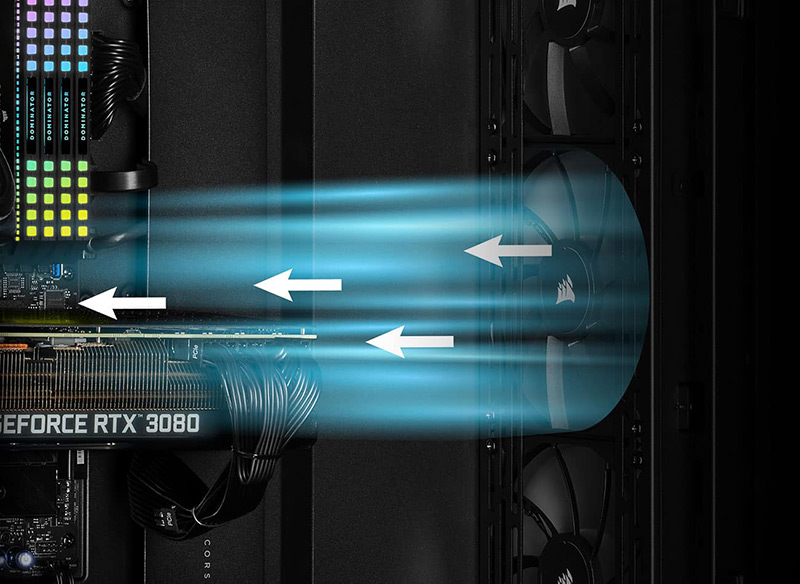 Điều hướng luồng không khí mạnh mẽ Công nghệ CORSAIR AirGuide sử dụng các cánh chống xoáy để tập trung luồng không khí, mang lại hiệu suất làm mát được cải thiện trên các bộ phận trong hệ thống của bạn. |