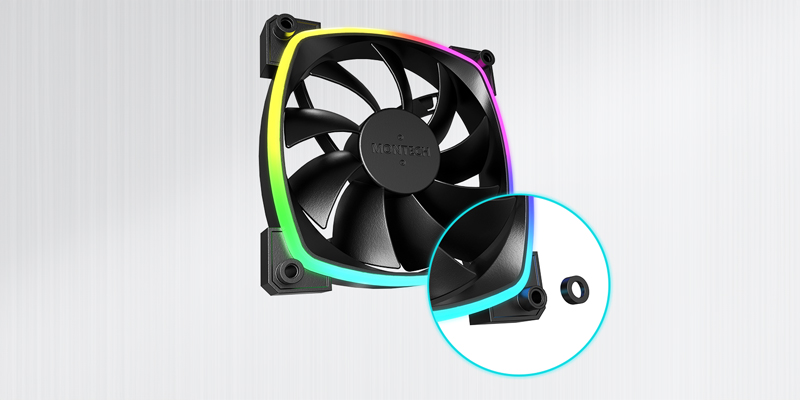 Fan Case Montech AX 120 PWM tích hợp 8 miếng đệm chống rung tròn của chúng tôi, giúp giảm độ rung và tiếng ồn do hiện tượng cộng hưởng.