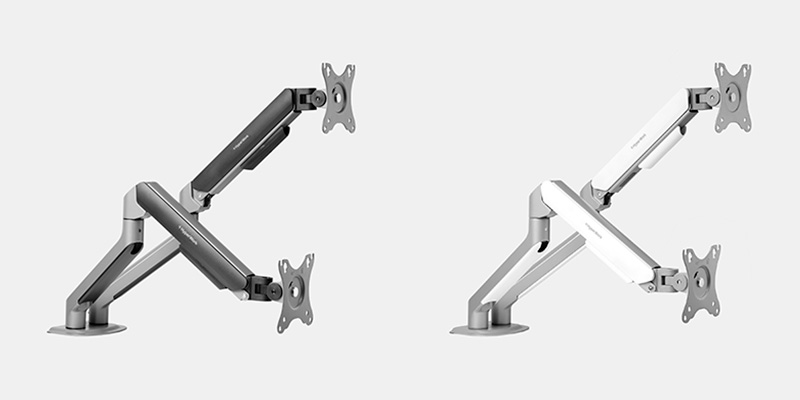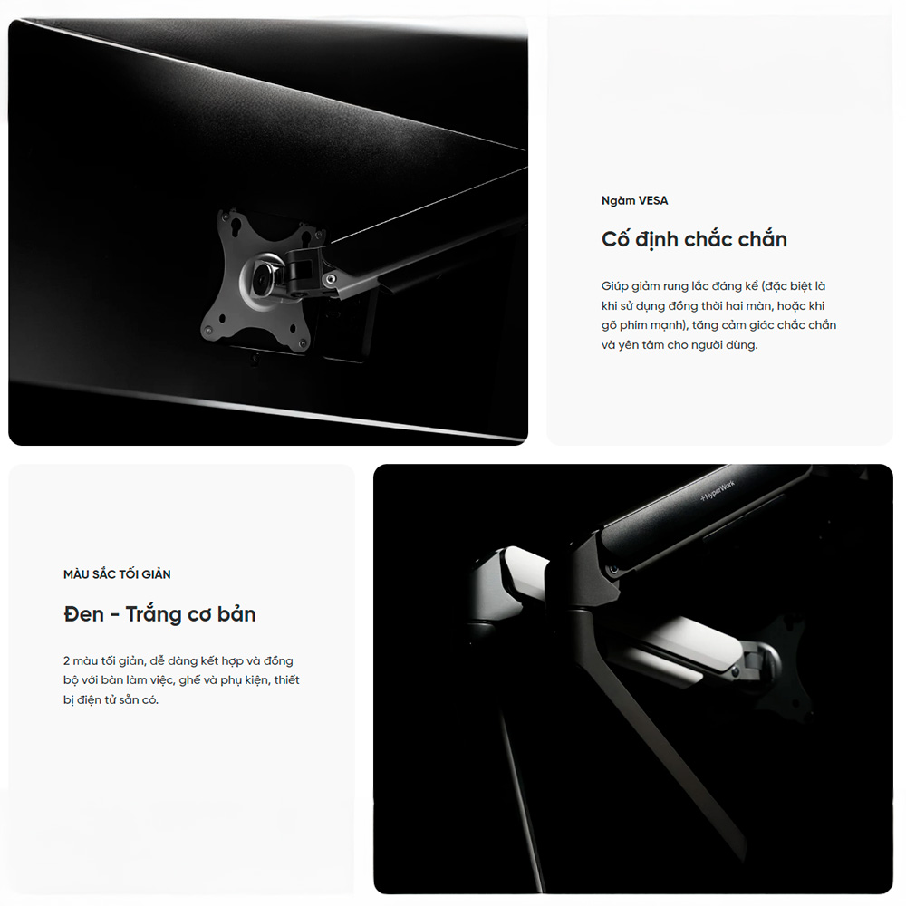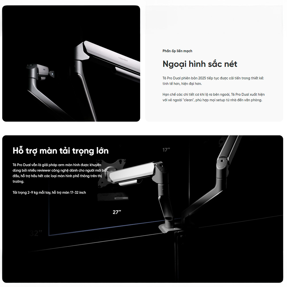 Giá đỡ 2 màn hình Hyperwork T6 Pro Dual 17-32 inch mang đến giải pháp tối thượng cho những ai đang sử dụng hệ thống Dual-Monitor (2 màn hình). Toàn bộ phần khung của cả hai cánh tay đòn đều được cấu thành từ sự kết hợp giữa nhôm, thép và nhựa cao cấp, đảm bảo độ cứng cáp và triệt tiêu rung lắc khi thao tác gõ phím. Bề mặt nhám mờ được hoàn thiện tinh xảo với hai tùy chọn màu sắc thanh lịch: