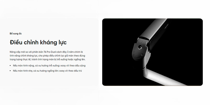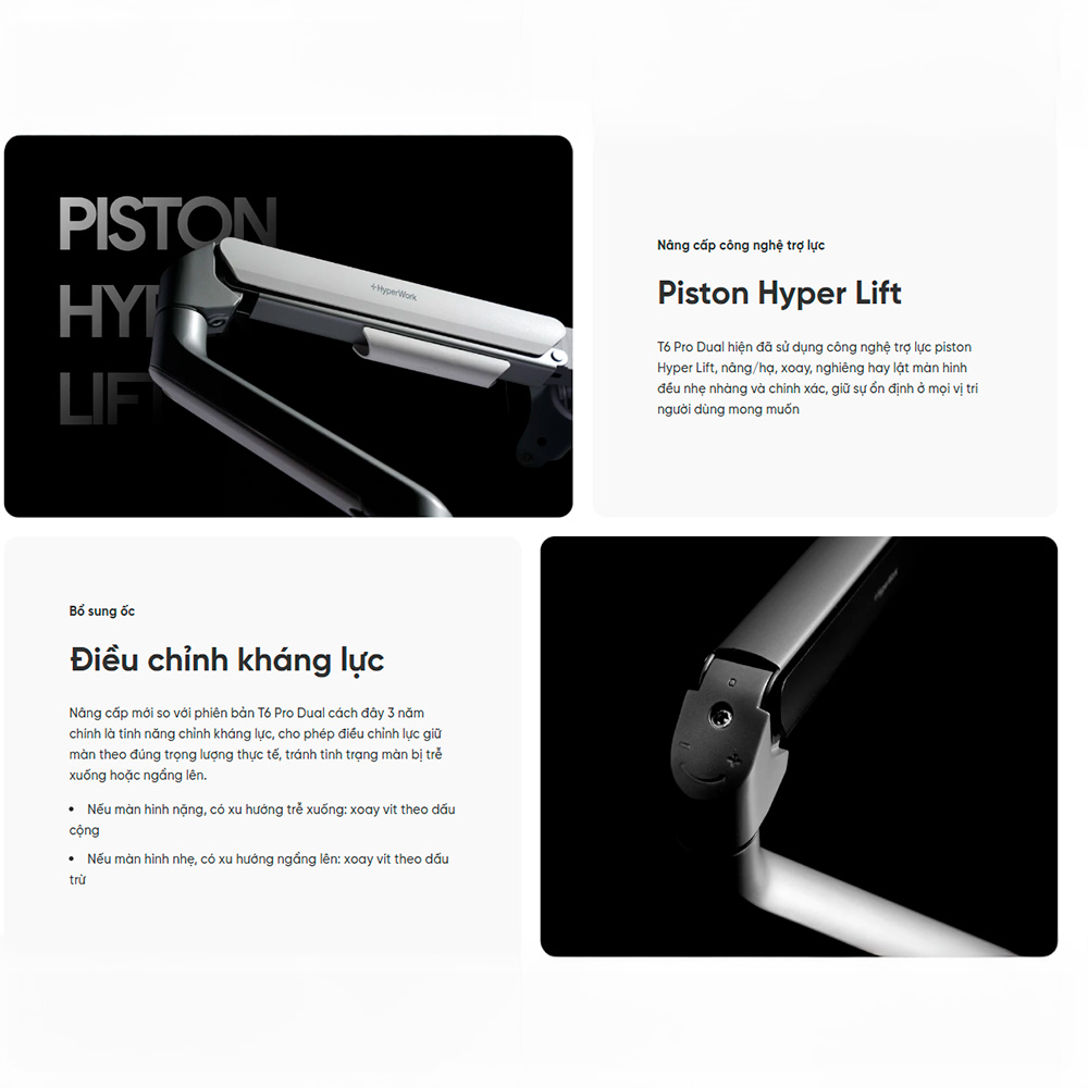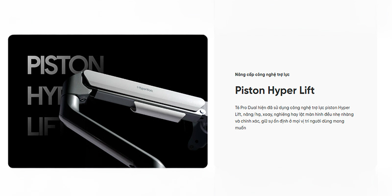 Bí quyết tạo nên sự êm ái khi nâng hạ của mẫu giá đỡ này nằm ở công nghệ Piston Hyper Lift được trang bị độc lập trên từng cánh tay đòn. Khác với lò xo cơ học thường cần nhiều lực để kéo, hệ thống khí nén piston giúp cân bằng hoàn hảo trọng lượng của thiết bị. Nhờ đó, bạn chỉ cần dùng một lực ép rất nhẹ từ đầu ngón tay là có thể điều chỉnh màn hình đến vị trí ưng ý, và ngay khi buông tay, màn hình sẽ dừng lại vững chãi, tĩnh lặng mà không hề bị hiện tượng sụt lún hay phát ra tiếng kêu cọt kẹt khó chịu.