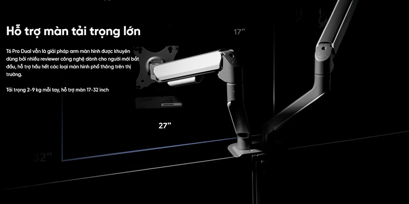 Sự nâng cấp về cấu trúc giúp giá đỡ màn hình trở thành một "lực sĩ" thực thụ trên bàn làm việc. Mỗi bên tay đòn được thiết kế với mức tải trọng an toàn trải dài từ 2 đến 9KG, hỗ trợ hoàn hảo cho các dòng màn hình có kích thước từ 17 đến 32 inch. Điều này đồng nghĩa với việc bạn có thể gắn cùng lúc hai chiếc màn hình đồ họa 27 inch hoặc hai màn hình gaming to bản 32 inch mà cụm trục ngàm vẫn chịu lực xuất sắc, không hề có hiện tượng gục hay xệ màn hình theo thời gian.