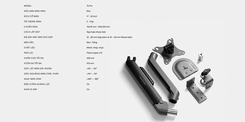 Không chỉ mang lại không gian làm việc gọn gàng và thẩm mỹ, Human Motion T6 Pro 2025 17-32 Inch còn giúp cải thiện tư thế ngồi, bảo vệ sức khỏe mắt, cổ và lưng nhờ khả năng tùy chỉnh linh hoạt. Đây là giải pháp hoàn hảo cho dân văn phòng cần sự thoải mái, designer muốn thay đổi góc nhìn sáng tạo hay game thủ mong muốn góc setup chuyên nghiệp. Với thiết kế thông minh và tính năng toàn diện, đây chính là giá đỡ màn hình công thái học đáng đầu tư nhất trong năm 2025.