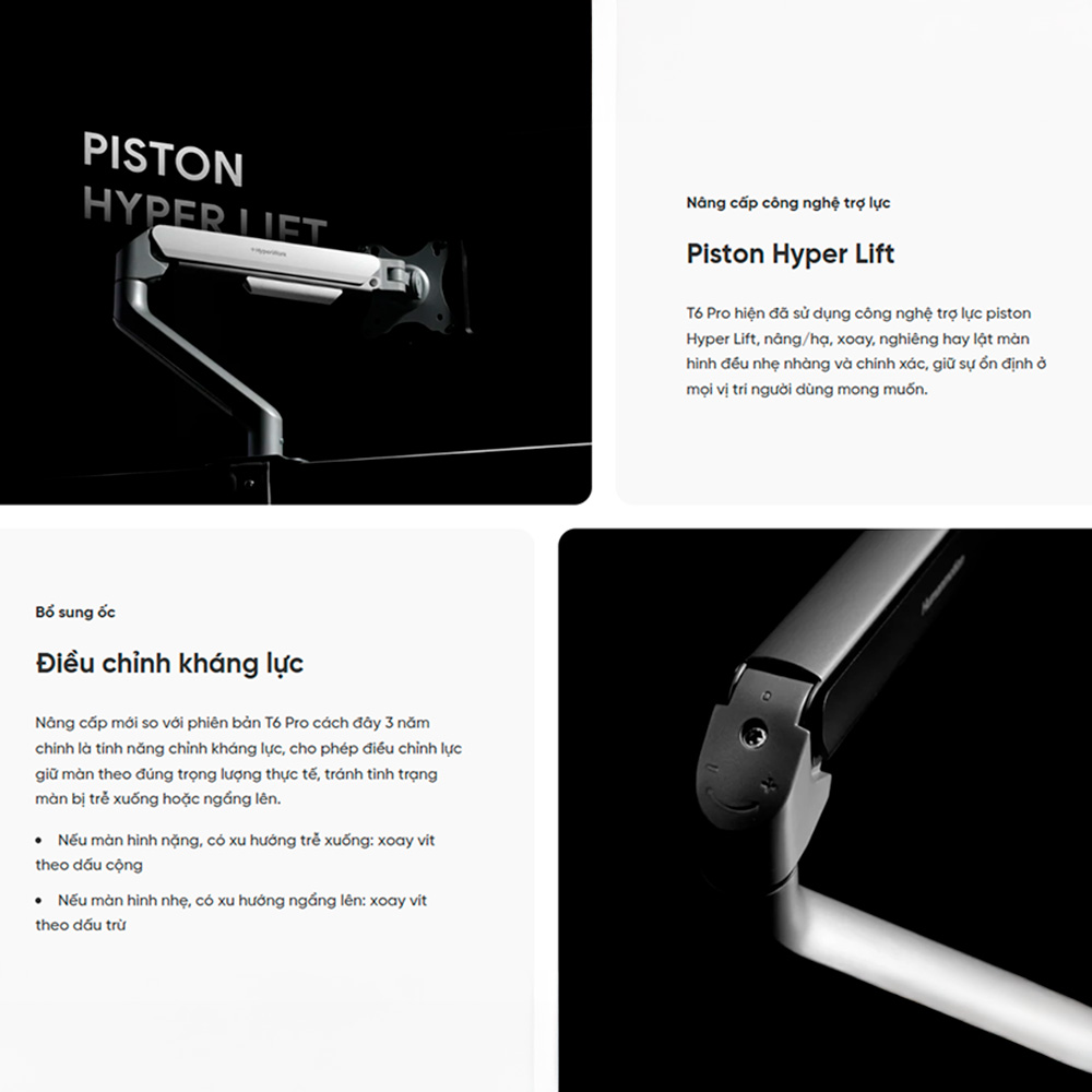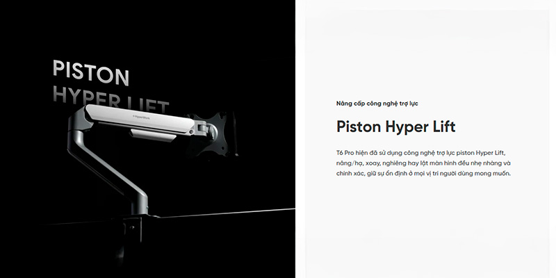 Giá đỡ màn hình Hyperwork T6 Pro 17-32 inch được trang bị hệ thống trợ lức Piston Hyper Lift cực kỳ nổi tiếng của hãng. Thay vì sử dụng lò xo cơ học truyền thống thường bị kêu cọt kẹt và nhanh nhão theo thời gian, piston khí nén giúp cân bằng hoàn hảo trọng lượng của chiếc màn hình. Nhờ vậy, màn hình sẽ lơ lửng vững chãi ở bất kỳ vị trí nào bạn thả tay ra, đồng thời quá trình nâng hạ diễn ra trơn tru, tĩnh lặng, không đòi hỏi người dùng phải dùng sức gồng hay siết ốc cố định.