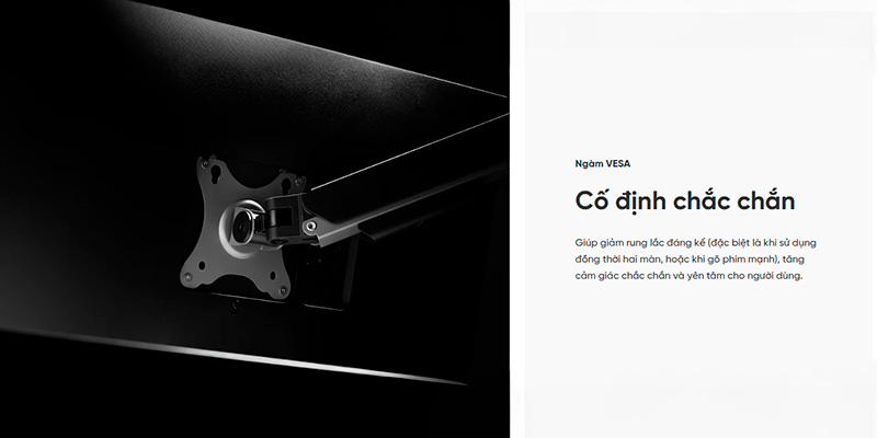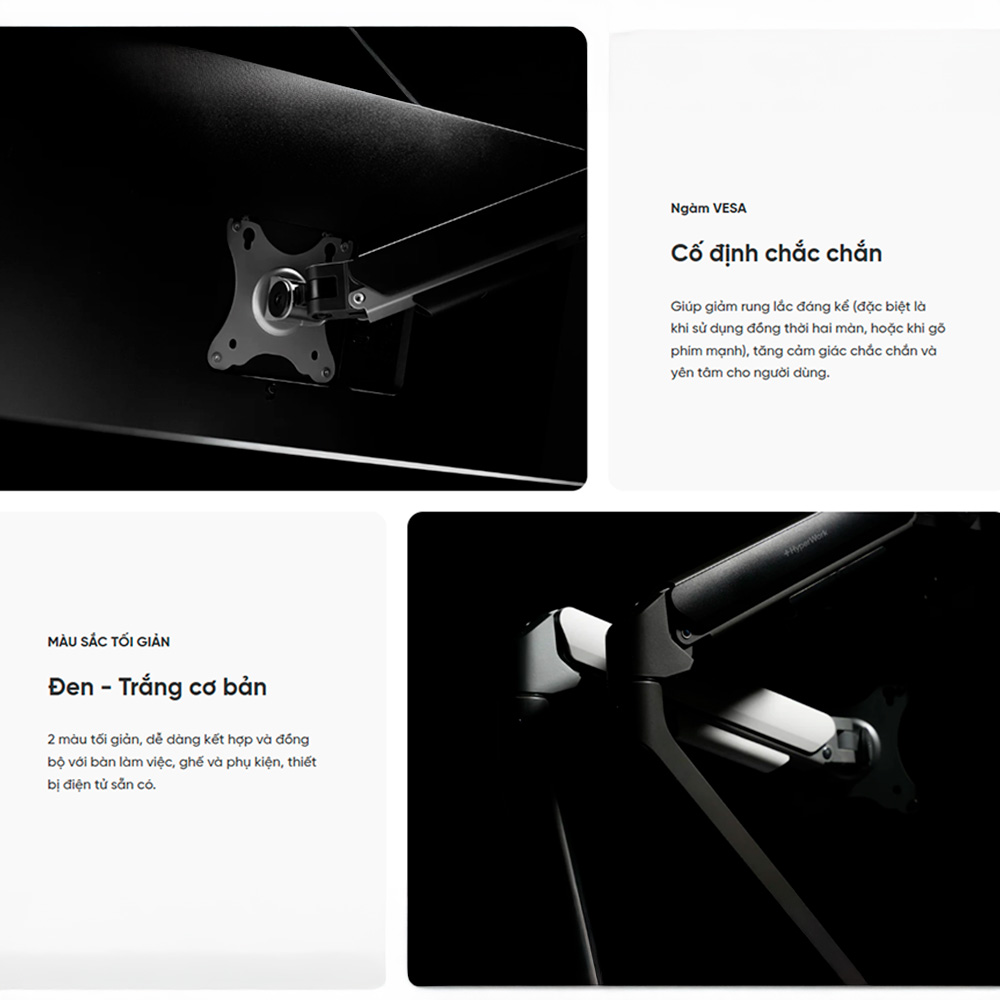 Điểm tiếp xúc cuối cùng giúp gắn kết toàn bộ hệ thống được Hyperwork tính toán rất linh hoạt. Phía trên, giá đỡ hỗ trợ chuẩn ngàm VESA 75 x 75mm và 100 x 100mm, tương thích với 99% các loại màn hình có lỗ ốc phía sau trên thị trường. Phía dưới đáy, bộ sản phẩm đi kèm sẵn bộ ngàm cho cả hai kiểu lắp ráp phổ biến nhất. Nếu không muốn làm hỏng mặt bàn, bạn có thể dùng ngàm Kẹp bàn (Clamp) với độ mở rộng hỗ trợ bàn dày từ 10 - 80mm. Ngược lại, nếu bàn của bạn có lỗ luồn dây điện sẵn hoặc bạn muốn setup áp sát hẳn vào tường, phương pháp Khoan lỗ (Grommet) hỗ trợ độ dày mặt bàn từ 10 - 40mm sẽ mang lại sự gọn gàng và thẩm mỹ tuyệt đối.