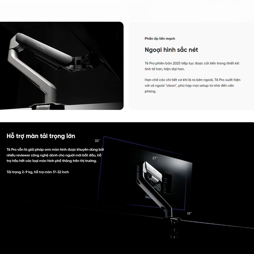Dù sở hữu thiết kế bên ngoài khá thanh thoát và tối giản, giá đỡ màn hình Hyperwork T6 Pro 17-32 inch lại mang trong mình sức mạnh nâng đỡ vô cùng đáng nể. Sản phẩm là dòng giá đỡ màn hình đơn (Single Arm) được thiết kế với mức tải trọng an toàn trải dài từ 2 đến 9KG. Thông số ấn tượng này giúp chiếc arm hỗ trợ hoàn hảo cho hầu hết các dòng màn hình máy tính phổ thông trên thị trường hiện nay, đặc biệt là các kích thước chuẩn từ 17 đến 32 inch. Bạn có thể hoàn toàn yên tâm gắn những chiếc màn hình đồ họa chuyên dụng hay màn hình gaming to bản mà không cần lo lắng về tình trạng trục ngàm bị gục, xệ hay rung lắc khi thao tác gõ phím mạnh tay.