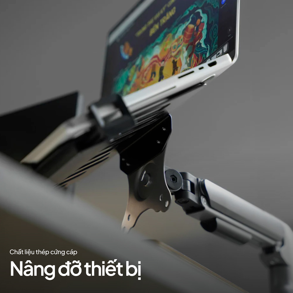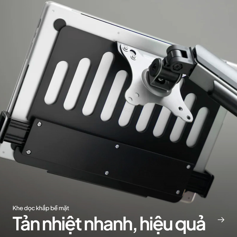 Bề mặt khay được phủ đệm EVA chống trượt kết hợp với gờ chặn an toàn, giữ laptop cố định trong quá trình sử dụng, hạn chế trầy xước và rơi rớt. Thiết kế này giúp người dùng yên tâm khi di chuyển hoặc điều chỉnh arm, đảm bảo thiết bị luôn an toàn. Đây là yếu tố quan trọng với những ai thường xuyên sử dụng laptop trong setup đa màn hình.