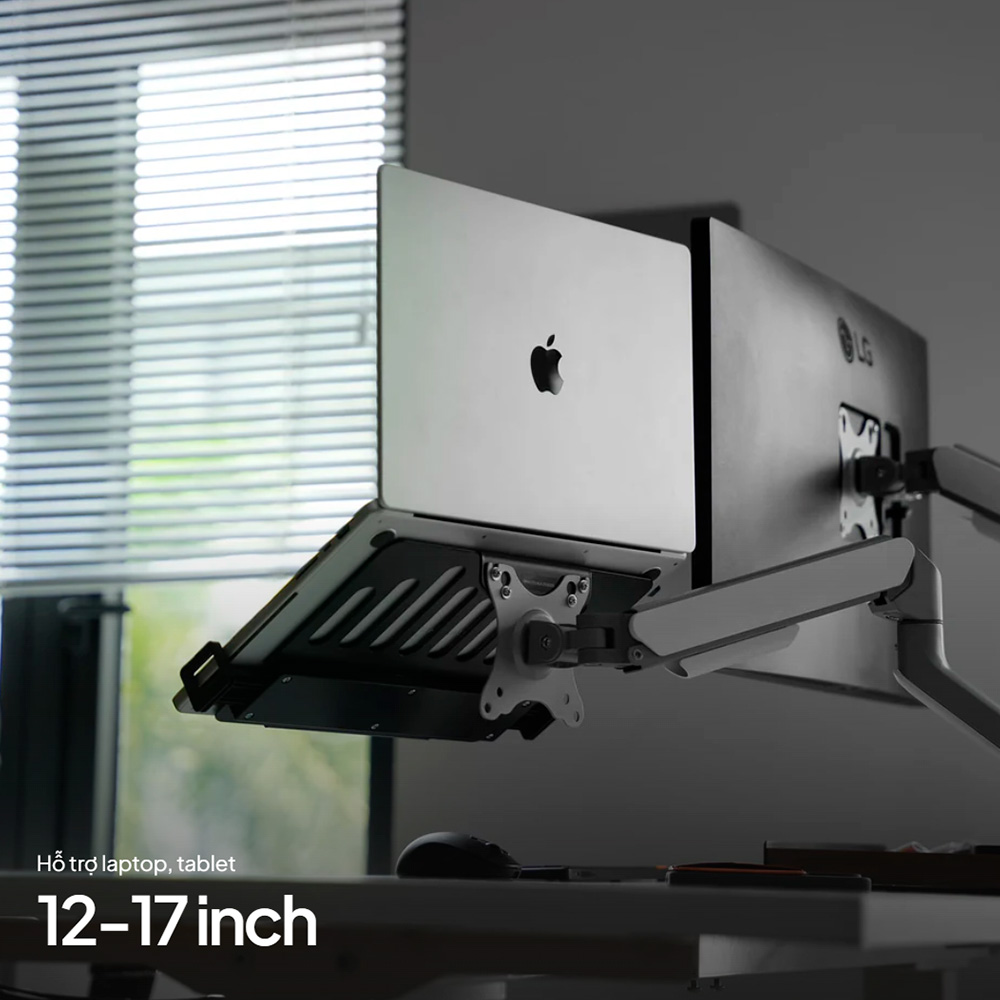 Sản phẩm có khả năng chịu tải tối đa 9kg, đảm bảo an toàn cho nhiều dòng laptop và tablet từ 12 đến 17 inch. Với kích thước khay 287-458 x 229 x 21 mm, giá treo có thể điều chỉnh phù hợp với nhiều loại thiết bị. Tính linh hoạt này giúp người dùng dễ dàng sắp xếp và tối ưu setup theo nhu cầu riêng, từ văn phòng đến gaming.