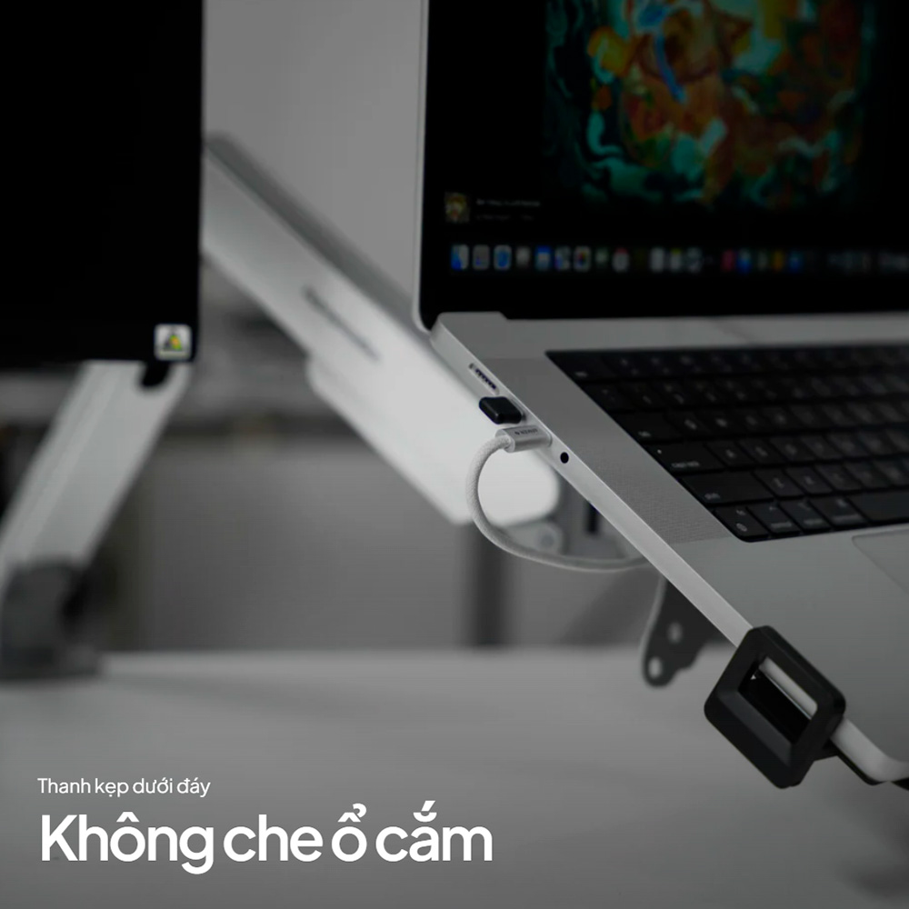 HyperWork VESA HPW-LT03-BLK được trang bị thanh kẹp dưới đáy có thể điều chỉnh độ rộng/hẹp, giúp cố định laptop chắc chắn mà không che khuất các cổng kết nối. Nhờ đó, người dùng vẫn dễ dàng sử dụng đầy đủ cổng sạc, USB hay HDMI khi lắp trên giá treo. Đây là chi tiết nhỏ nhưng rất hữu ích, nâng cao trải nghiệm khi làm việc lâu dài.