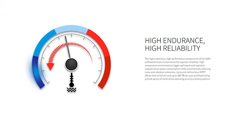 Hệ thống giám sát không bao giờ ngủ, và ổ cứng S300 cũng vậy. Sản phẩm được chế tạo với các linh kiện cao cấp, hỗ trợ khả năng ghi chép dữ liệu cường độ cao và hoạt động bền bỉ suốt 24 giờ mỗi ngày, 7 ngày mỗi tuần. Công nghệ độc quyền từ Toshiba giúp thiết bị chịu được môi trường nhiệt độ khắc nghiệt thường thấy bên trong các thùng máy đầu ghi hình xếp chồng chật hẹp, mang lại sự an tâm tuyệt đối cho khối tài sản và dữ liệu an ninh của bạn.