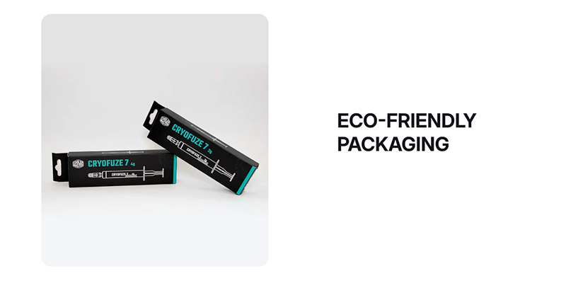 Cooler Master chú trọng đến việc bảo vệ môi trường, do đó kem tản nhiệt CRYOFUZE 7 được đóng gói trong bao bì thân thiện với môi trường. Việc này không chỉ giảm thiểu tác động tiêu cực đến hành tinh của chúng ta mà còn thể hiện cam kết của hãng trong việc phát triển các sản phẩm bền vững và có trách nhiệm.