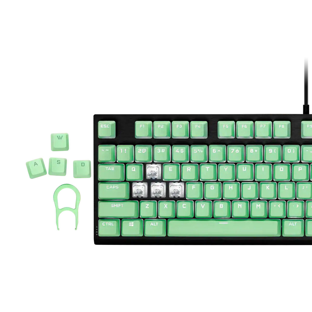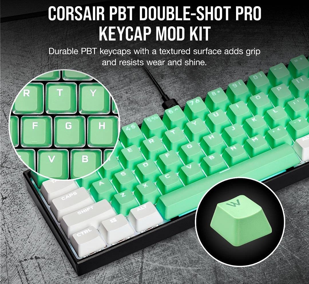 Keycap Corsair PBT Double-Shot PRO Mint Green Cực bền Keycaps được làm từ nhựa PBT dày đặc với kết cấu bề mặt giảm sự phai màu của phím. |