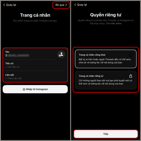 - Bước 3: Thay đổi thông tin cá nhân hoặc giữ nguyên các đồng bộ từ Instagram, sau đó nhấn Bỏ qua để chuyển đến màn hình tiếp theo. Chọn vào Quyền riêng tư của bạn trên Threads → Nhấn Tiếp.