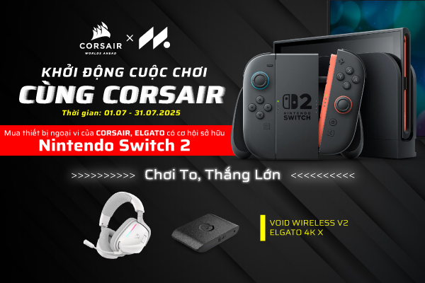 Từ ngày 01/07 đến 31/07/2025, khi mua sản phẩm thiết bị ngoại vi Corsair hoặc Elgato, bạn sẽ có cơ hội nhận những phần quà công nghệ cực hot – từ tai nghe gaming không dây đến cả máy chơi game Nintendo Switch V2!