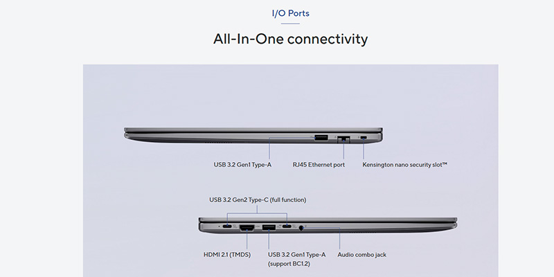 Laptop Asus ExpertBook P3 P3605CVA-PL0042W tích hợp đa dạng cổng kết nối như 2 USB-A, 2 USB-C hỗ trợ Power Delivery và xuất hình ảnh, HDMI 2.1, jack tai nghe 3.5mm, cổng mạng RJ45, giúp kết nối dễ dàng với nhiều thiết bị ngoại vi. Bàn phím chiclet có đèn nền hỗ trợ làm việc ban đêm, camera FHD tích hợp nắp che riêng tư và cảm biến vân tay tích hợp trên nút nguồn đảm bảo khả năng bảo mật cá nhân cao. Máy còn được cài sẵn Windows 11 Home cùng hàng loạt tính năng bảo mật như TPM 2.0, BIOS Self Recovery và McAfee LiveSafe.