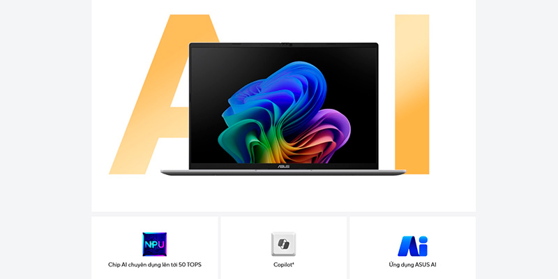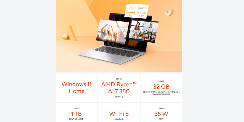 Laptop Asus Vivobook 16 M1607KA-MB091WS sử dụng bộ xử lý AMD Ryzen™ AI 7 350 kết hợp card đồ họa AMD Radeon Graphics, mang đến hiệu suất vượt trội, xử lý nhanh chóng các tác vụ văn phòng, đa nhiệm mượt mà, đồng thời hỗ trợ giải trí và làm đồ họa nhẹ nhàng, đáp ứng tốt các nhu cầu học tập, làm việc và giải trí hằng ngày.