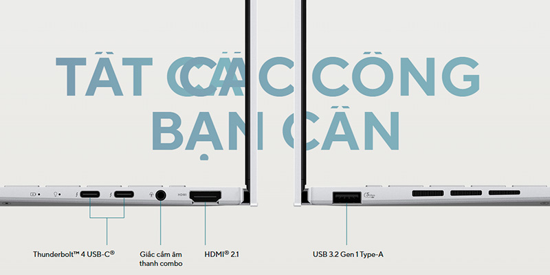 Máy hỗ trợ Wi-Fi 7 chuẩn 802.11be, mang đến tốc độ mạng cực nhanh và ổn định kể cả trong môi trường đông người. Kết nối ngoại vi đa dạng với 2 cổng Thunderbolt™ 4 (40Gbps), 1 HDMI 2.1 TMDS, 1 USB 3.2 Gen 1 Type-A và jack Audio/Mic 3.5mm, đáp ứng đầy đủ nhu cầu sử dụng thiết bị ngoại vi hiện đại. Về âm thanh, máy được trang bị Smart Amp Technology cùng loa và mic kép cho trải nghiệm nghe gọi, họp online chân thực và rõ nét. Hỗ trợ Bluetooth 5.4 giúp kết nối thiết bị không dây nhanh chóng và ổn định hơn, đặc biệt với các phụ kiện hiện đại như tai nghe, chuột, bàn phím.