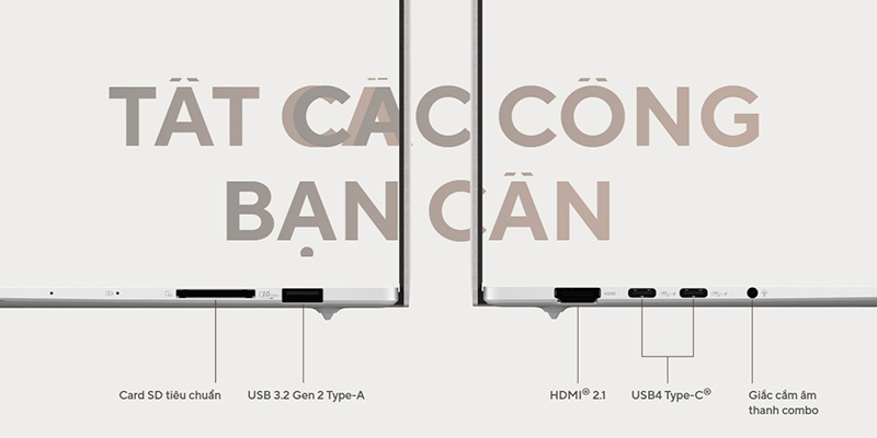 Laptop được trang bị Wi-Fi 7 băng tần ba cho tốc độ truy cập internet siêu nhanh và ổn định. Ngoài ra, 2 cổng USB4 Gen 3 Type-C (40Gbps) hỗ trợ sạc và xuất hình ảnh, 1 cổng HDMI 2.1, 1 USB-A 10Gbps và đầu đọc SD 4.0 giúp người dùng dễ dàng kết nối với mọi thiết bị ngoại vi hiện đại.