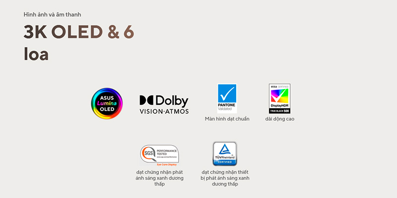 Sản phẩm sở hữu màn hình 16 inch 3K OLED (2880x1800) 120Hz chuẩn điện ảnh 16:10, hỗ trợ HDR, 1.07 tỷ màu, độ sáng cực đại 500nits. Màn hình đạt chuẩn VESA DisplayHDR True Black 500, độ phủ màu 100% DCI-P3, cùng các chứng nhận TÜV Rheinland, SGS giúp giảm 70% ánh sáng xanh, bảo vệ mắt trong quá trình sử dụng kéo dài – đặc biệt phù hợp với dân sáng tạo nội dung và làm việc chuyên sâu.