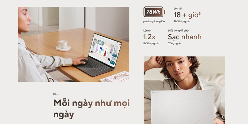 Sử dụng viên pin lớn 78Wh, cùng bộ sạc Type-C 65W Ultra Mini Adapter, laptop có thể duy trì làm việc từ sáng đến tối chỉ với một lần sạc. Hệ sinh thái phần mềm như MyASUS, GlideX, ScreenXpert và StoryCube giúp đồng bộ hóa thiết bị, chia sẻ màn hình, quản lý file và tối ưu hiệu suất đơn giản chỉ trong vài thao tác.