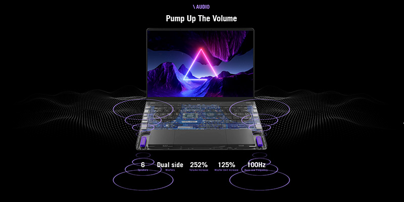 Hệ thống loa trên Asus ROG Zephyrus G14 GA403UV-QS091W được tối ưu hóa với công nghệ Dolby Atmos, mang đến âm thanh vòm sống động và chi tiết. Kết hợp với Hi-Res Audio và micro khử tiếng ồn AI, sản phẩm không chỉ phù hợp để chơi game mà còn lý tưởng cho các buổi họp trực tuyến hoặc thưởng thức âm nhạc, phim ảnh.